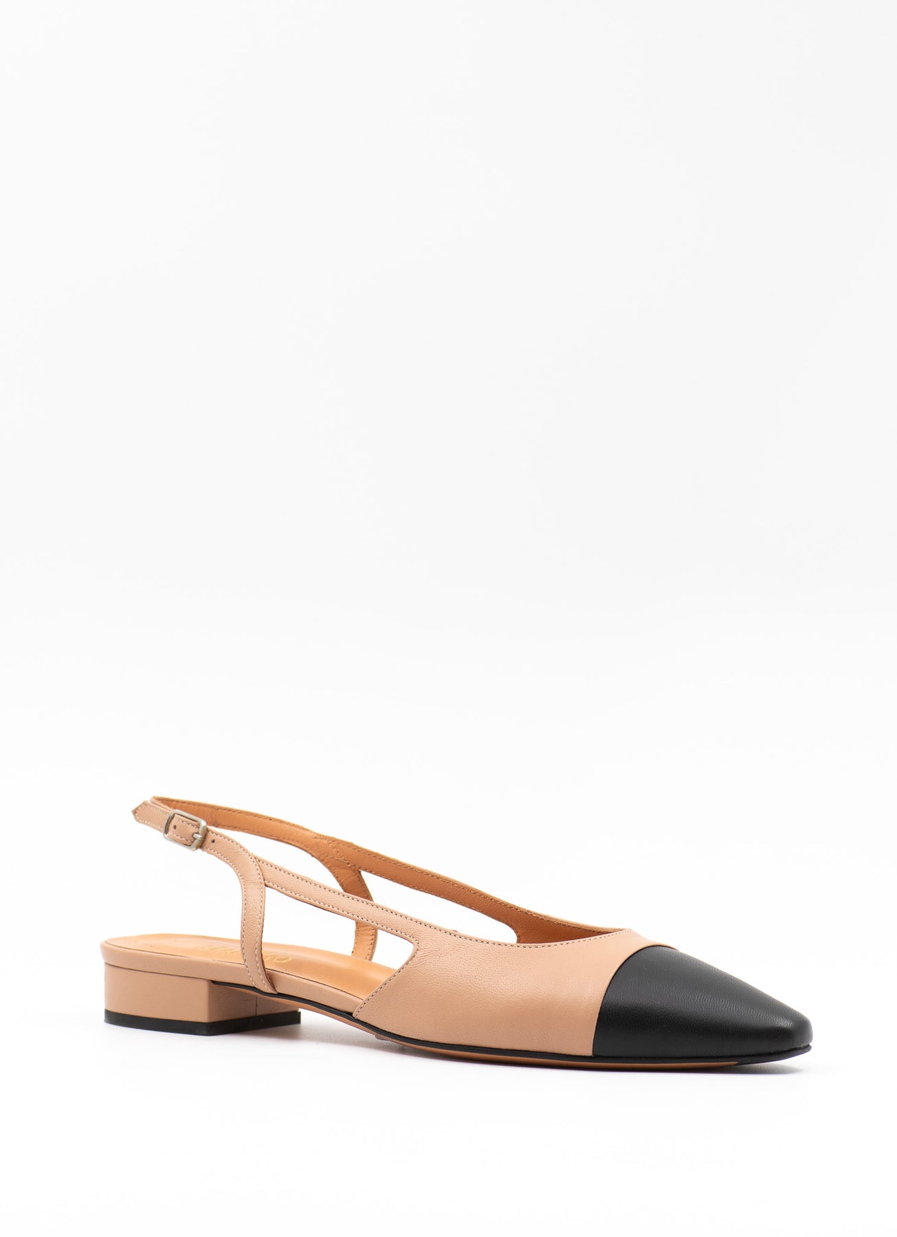 Our bestselling slingback with a soft padded insole for ultimate comfort. Made from smooth beige leather, featuring a contrasting cap toe in black leather.