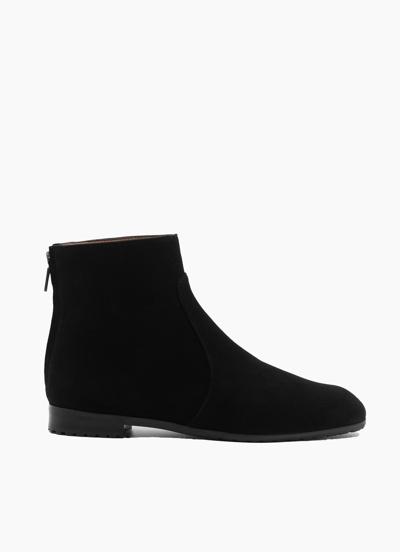 These short ankle boots have been a favourite among our customers for many years, and we can see why. The feminine, yet sleek design makes them perfect for both everyday use and dressier occasions. They have been handmade in Italy from soft black suede and feature practical rubber lug soles with patterned indentations designed to ensure a good grip. Easy to take on and off thanks to the zipper in the back.