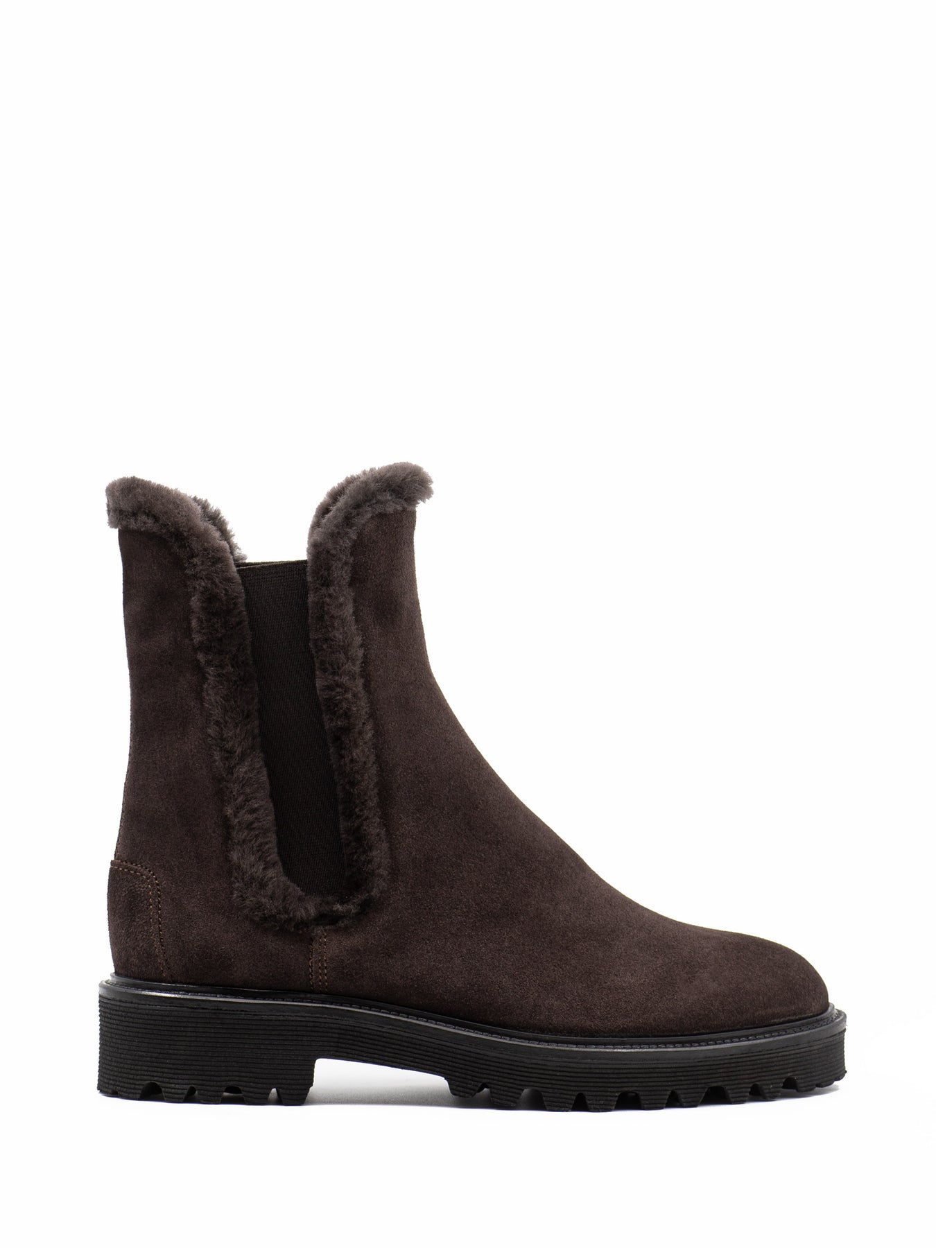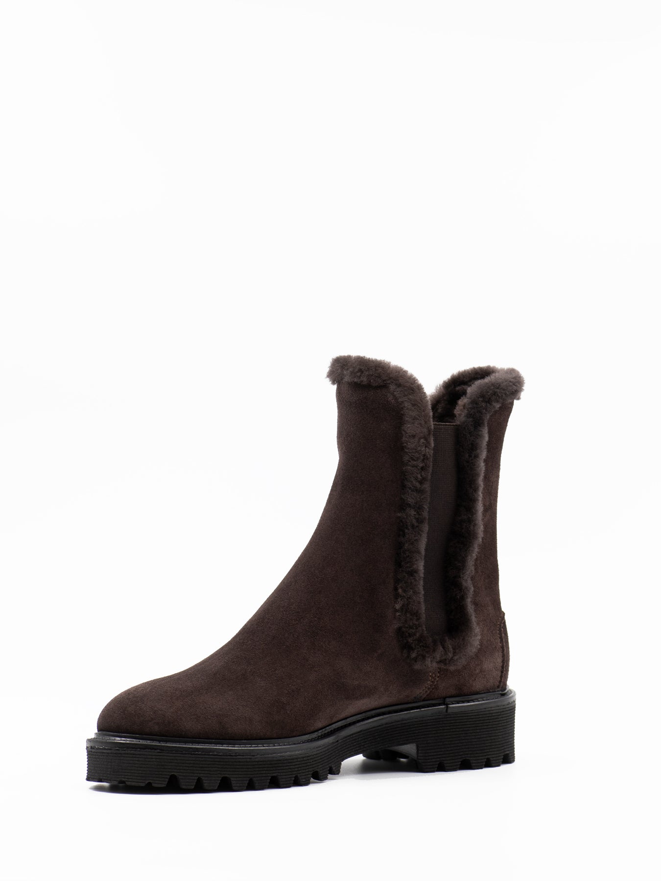Cosy up in our seasonal take on the Chelsea boots. This pair are lined in warm shearling leather and feature shearling trims. Handmade in Italy from brushed brown suede, and have stretch side gussets for easy wear.