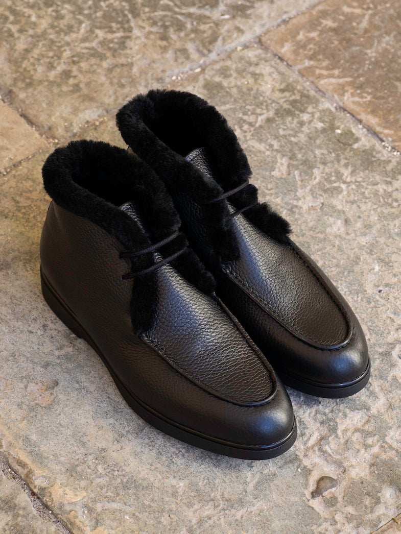 The Stella ankle boots are made from grained black calf leather and are fully lined with warm shearling that peep over the edges. They are designed with almond-shaped toes with stitch detailing on the uppers. This pair will keep you warm and stylish during the colder months.