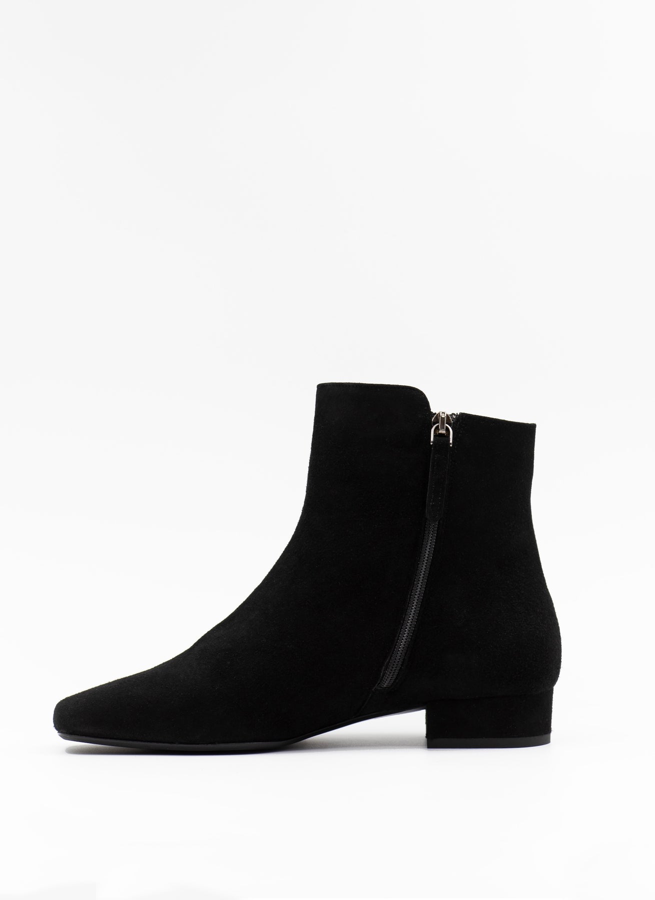The perfect from desk-to-dinner ankle boot. Handcrafted in Italy from soft black suede, these boots go just as well to a pair of trousers as to a flowy midi dress. Set on a 25 mm block heel and feature a discreet rubber sole, these minimalistic designed boots with square shaped toes will be your next wardrobe hero.