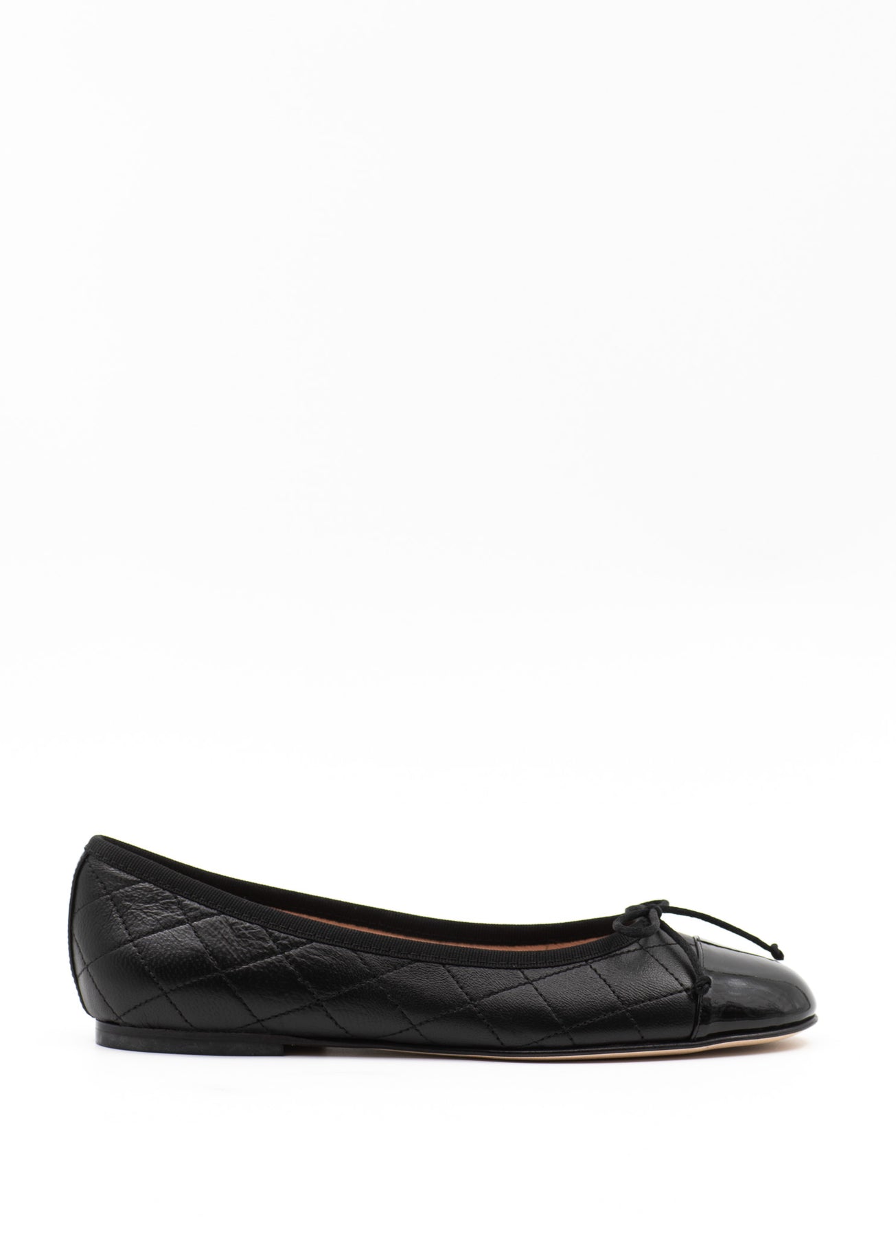 These ballet flats have been handmade in Italy from smooth quilted black leather and feature a contrasting cap toe in black patent leather. They have rounded toes and are tipped with a bow. Slip your pair into your tote - you might need them after a day in heels.