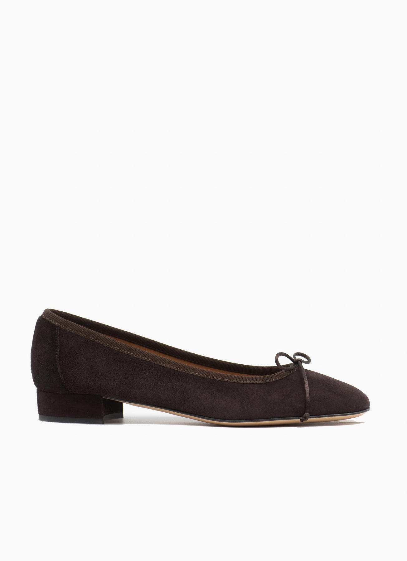 Our classic Scala ballet flats, but with a slight 25 mm heel for just the right amount of lift. They have been carefully handcrafted in Florence, Italy by skilled artisans. This pair are made from brown suede leather, featuring tonal grosgrain trim and a satin bow at the front.